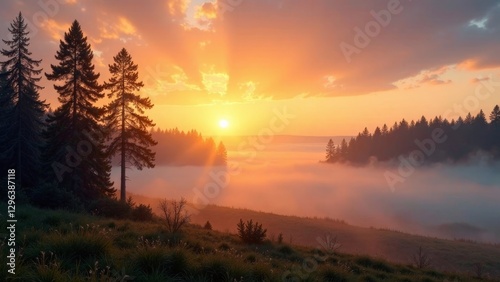 Obraz premium Serene Sunrise Over Misty Mountain Meadow with Silhouetted Evergreen Trees