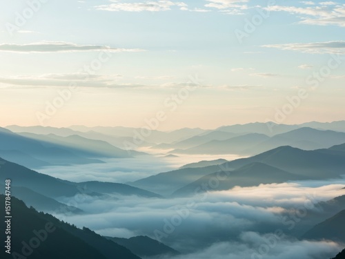 Fototapeta premium Serene sunrise over misty mountain ranges