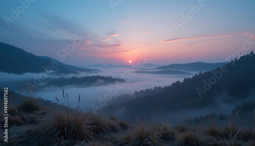 Obraz premium Serene Sunrise Over Misty Mountain Valley Breathtaking Landscape Photography