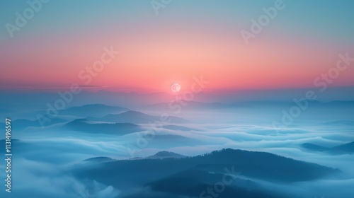 Fototapeta premium Serene sunrise over misty mountains with full moon.