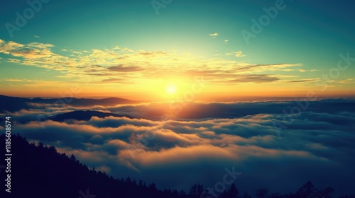 Fototapeta premium Serene sunrise over misty mountains with vibrant clouds and a tranquil sky...