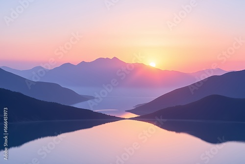 © Donny, Fototapeta premium Serene Sunrise Over Mountain Lake