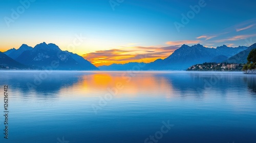 Naklejka premium Serene Sunrise Over Mountain Lake And Town