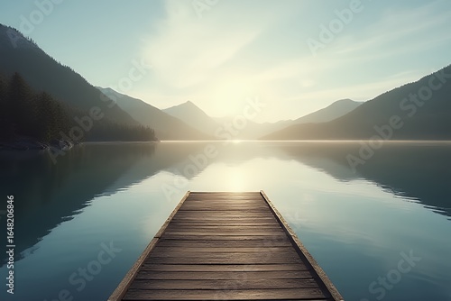 Fototapeta premium Serene Sunrise over Mountain Lake with Wooden Dock