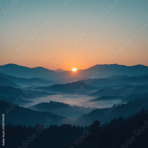 © tanawatbig, Fototapeta premium Serene Sunrise Over Mountain Range with Misty Valley Landscape