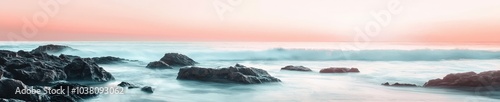 Fototapeta premium Serene Sunrise Over Ocean Waves and Rocky Shoreline