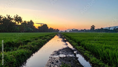 © Kitta Studio, Fototapeta premium Serene Sunrise Over Rice Field with Reflections and Vibrant Colors