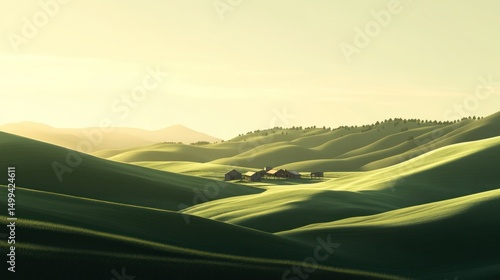Obraz premium Serene Sunrise over Rolling Green Hills and Farmhouse