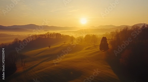 © pimpat, Obraz premium Serene Sunrise Over Rolling Hills and Misty Valley Landscape