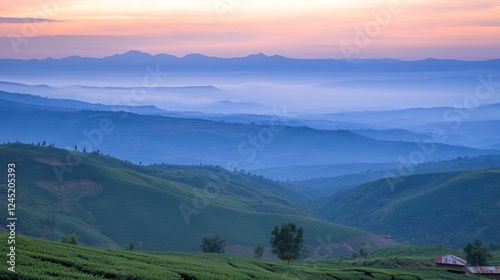 © Atmospheric stock, Obraz premium Serene sunrise over rolling tea plantations and misty mountains in rwanda