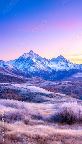 © Olivia, Obraz premium Serene sunrise over snow-capped peaks and frosted foothills