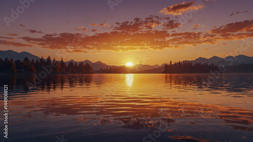 © xeionise, Naklejka premium Serene Sunrise Over Tranquil Lake And Mountains