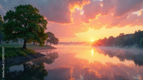 © Vibrant Visions Pixe, Obraz premium Serene sunrise over tranquil lake, majestic trees reflected in calm water, soft morning mist