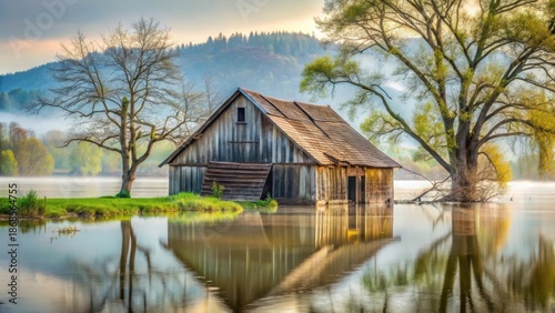 © Collection, Obraz premium Serene sunrise over tranquil waters reflecting a weathered lakeside structure nestled amidst budding trees and gentle mist