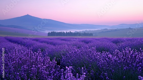 © DIAHIMAGESNEW, Fototapeta premium Serene sunrise over vast lavender fields and misty mountains.