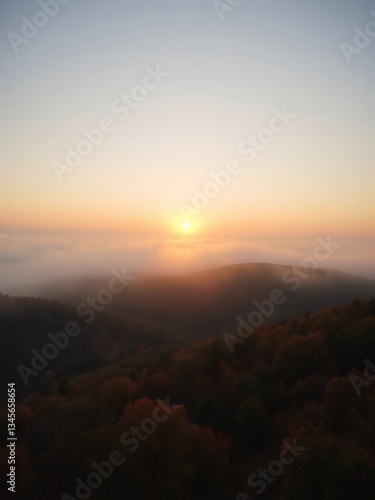 © NguyenBa, Fototapeta premium Serene sunrise paints misty hills warm autumnal hues. AI Generated