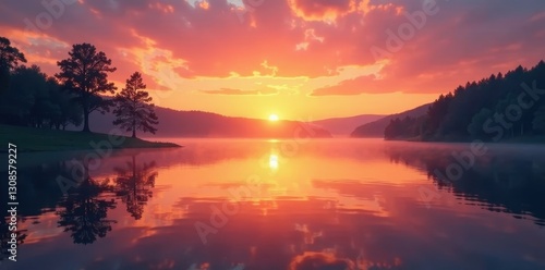 Fototapeta premium Serene sunrise paints the still waters of a small, empty lake, trees...