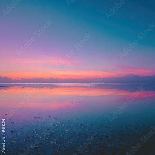 © Abu, Fototapeta premium Serene sunrise reflection over calm ocean waters. Soft hues of pink, orange, and blue paint the sky and water, creating a peaceful ambiance. Horizon is calm and flat