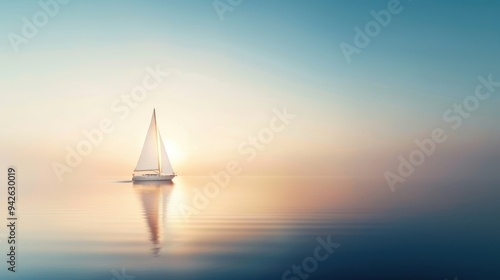 © nattapon98, Fototapeta premium Serene sunrise sailing, a lone sailboat glides across calm waters, reflecting gentle hues of dawn in a tranquil bay, inviting peace and solitude.