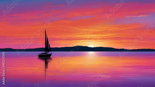 Fototapeta premium Serene sunset at sea with a single sailboat silhouetted against a vibrant...