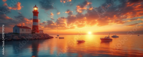 © tydeline, Fototapeta premium Serene Sunset at the Lighthouse: A Coastal Masterpiece