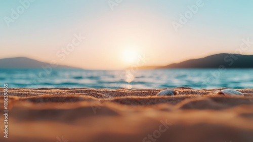 © Narongsag, Naklejka premium Serene Sunset Beach Golden Sand Ocean Waves Seashells