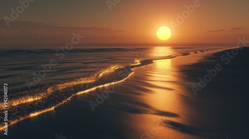 Naklejka premium Serene Sunset Beach Photograph: Golden Sun Setting Over Dark Ocean with Black...