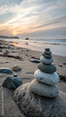 Fototapeta premium Serene Sunset Beach Stones Balanced Rock Stacking Art Photography