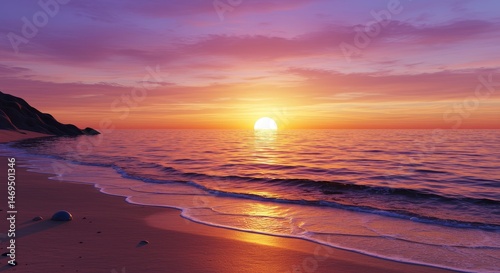 © Seree , Fototapeta premium Serene Sunset Beachscape - Tranquil ocean waves gently lap a sandy shore at sunset, bathed in warm, vibrant colors
