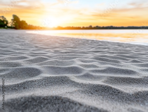 © heinng, Fototapeta premium Serene sunset casts warm light on gently rippled beach sand. AI Generated