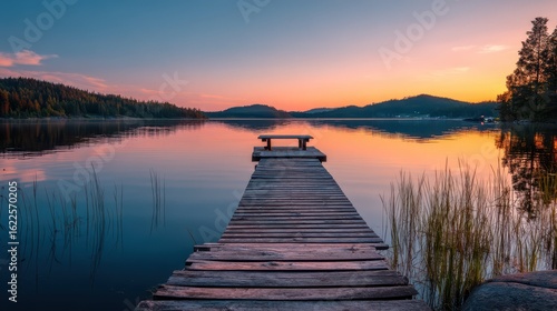 © Kitta Studio, Fototapeta premium Serene Sunset Dock over Calm Lake Waters Surrounded by Nature