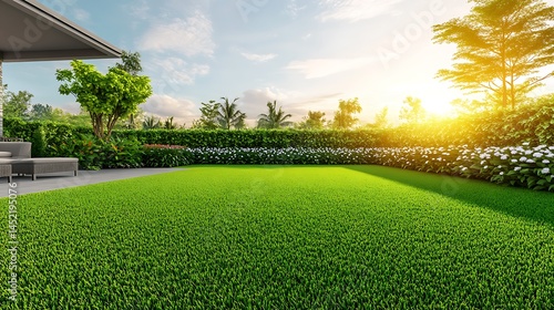 Naklejka premium Serene Sunset Garden: Lush Green Lawn, Blooming Flowers, and Tranquil Atmosphere