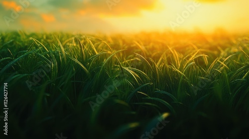 Fototapeta premium Serene sunset glow over lush green grass field creating a tranquil natural...
