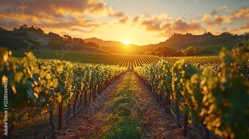 © Bussakon, Fototapeta premium Serene Sunset Glow Over Picturesque Countryside Vineyard Landscape