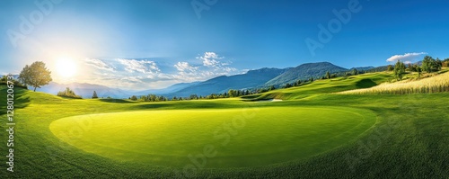 © Flain, Obraz premium Serene Sunset Golf Course Panorama: Breathtaking Mountain Views
