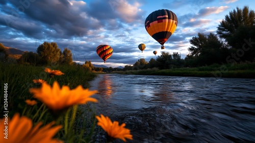 © yen , Obraz premium Serene Sunset Hot Air Balloon Flight Over Calm River and Lush Greenery