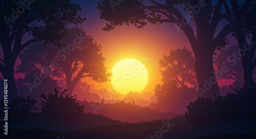 Fototapeta premium Serene sunset illuminating a forest landscape with vibrant colors and...