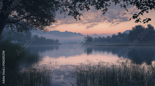 © Killian, Obraz premium Serene Sunset Lake: Misty Mountains, Tranquil Waters, 3D Render