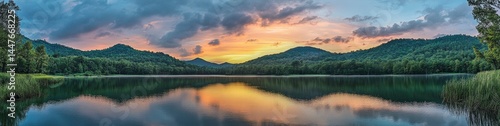 © AYESKIA, Fototapeta premium Serene Sunset Lake: Mountain Panorama in Peaceful Hues