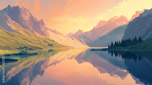 © muhammad, Fototapeta premium Serene sunset lake reflecting mountains
