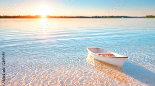 © BROPRADANA, Naklejka premium Serene sunset lake with small boat, tranquil waters, peaceful background, ideal for travel brochures