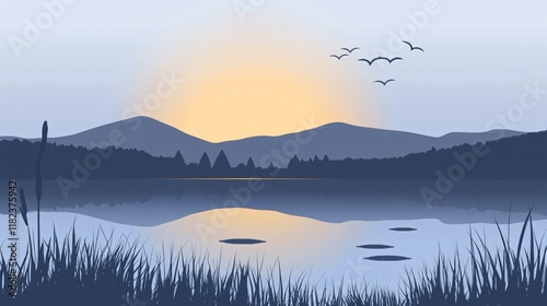 Fototapeta premium Serene Sunset Landscape, Calm Lake, Mountains, and Birds