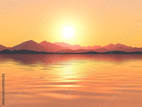 © Shahina, Fototapeta premium Serene Sunset Landscape: Golden Hour Over Calm Lake and Mountains