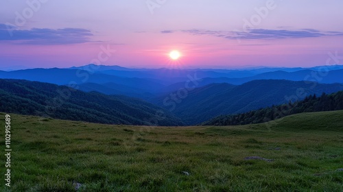 © BOJOShop, Obraz premium Serene Sunset Landscape Majestic Mountains Grassland Peaceful Sky