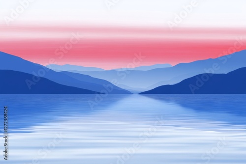 Fototapeta premium Serene Sunset Landscape: Mountains Mirrored in a Calm Lake
