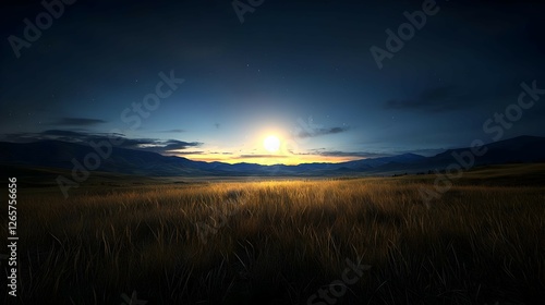 © artzone, Obraz premium Serene Sunset Landscape Over Golden Grass Field