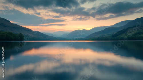 © Milon, Fototapeta premium Serene sunset landscape peaceful mountain lake calm waters scenic view tranquil nature photography