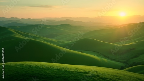© Shahina, Obraz premium Serene Sunset Landscape, Rolling Green Hills at Golden Hour