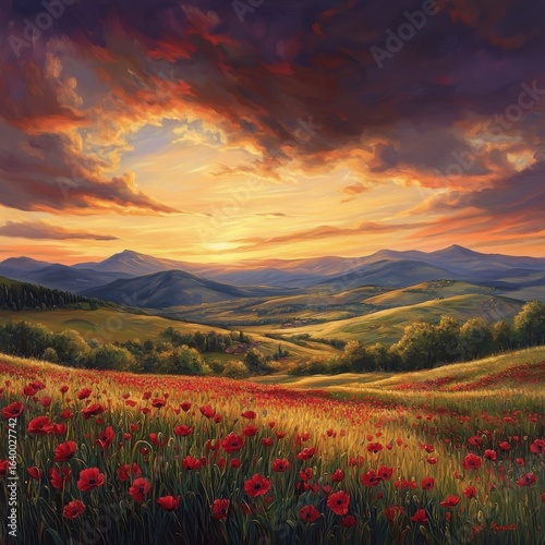 © vectcore, Fototapeta premium Serene Sunset Landscape. Vibrant Poppy Field, Rolling Hills, Dramatic Sky, Impressionistic Painting Style