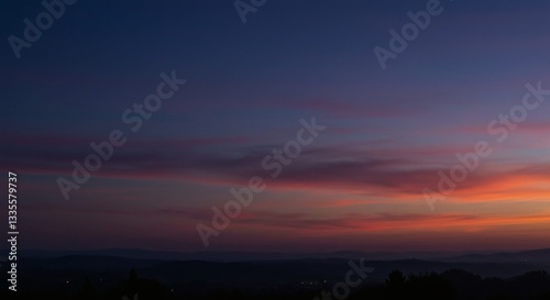 © IPutuToya, Obraz premium Serene Sunset Landscape Vibrant Sky with Pastel Hues Over Distant Hills